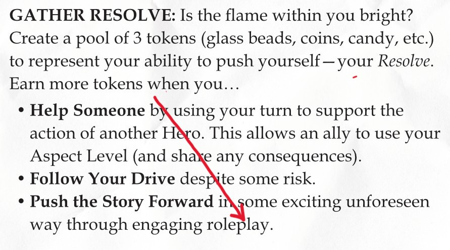 GATHER RESOLVE: Does the flame within you burn bright? Create a pool of 3 tokens (glass beads, coins, candy, etc.) to represent your ability to push yourself—your Resolve. Earn more tokens when you…