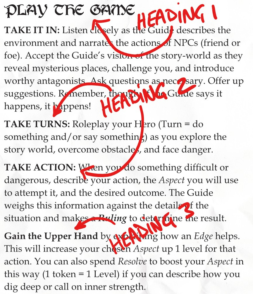 Designing Heirs of All Eternity has already taught me so much (and I’m not even done). It’s forced me to rethink rules and mechanics. It’s pushed me to focus on clarity and tone. And it’s helped me realize that good writing/formatting/layout equals good game design.