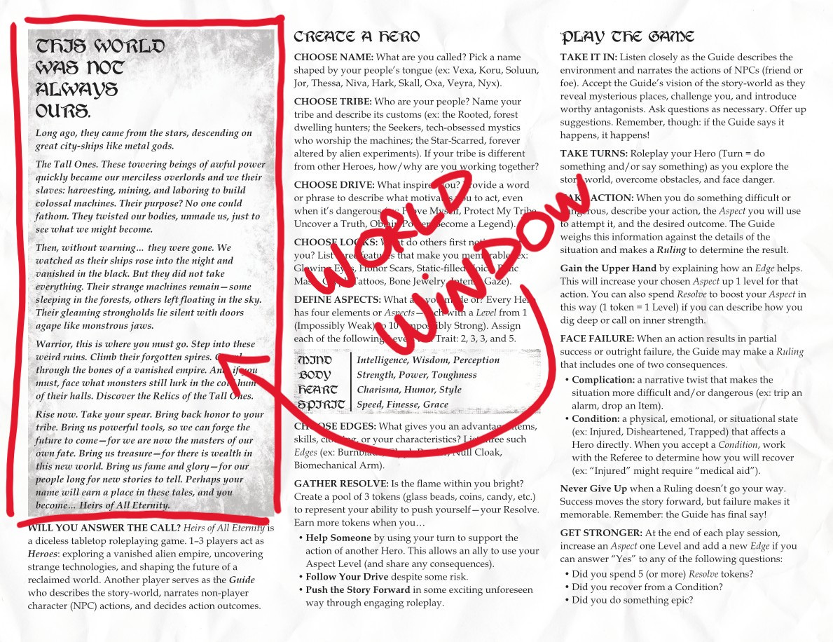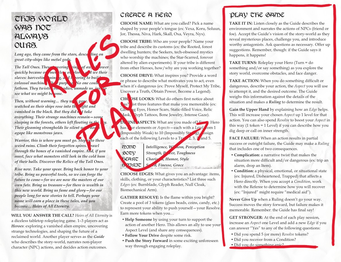 It’s probably safe to assume most one-page RPG players have some kind of roleplaying experience, and I wanted Heirs of All Eternity to follow a pretty traditional formula. Meh… I think that’s enough.