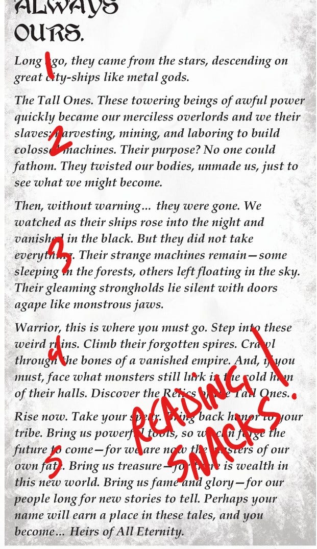 I mean, if our game is to be a “fully playable RPG system on a single sheet of paper, it should provide a setting for players to explore, right? But with only one page, we need to keep the word count super low. I ended up getting it down to about 230 words… after tons of revising and cutting (turns out this part of one-pager design is the most difficult for me, by far)!