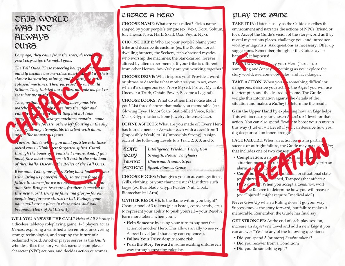 To be a complete RPG system, a one-pager must also lead players through creating a unique hero.